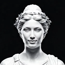 Meity Avatar - black and white statue of a woman with a floral headband, wearing a classical draped dress.